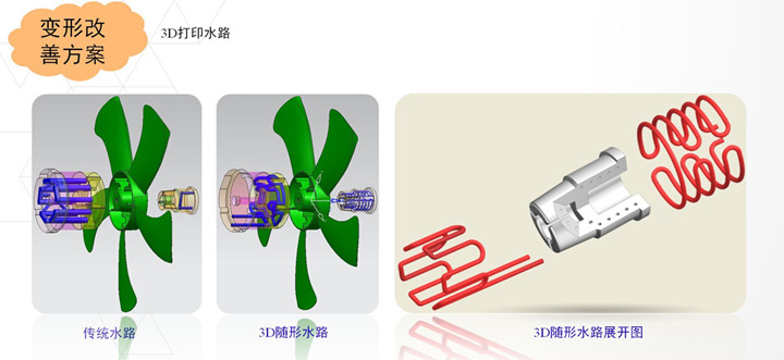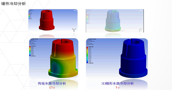 3D打印随形水路使注塑件能够快速冷却,提高生产效率。仿真与生产相结合,让产品更加完美。